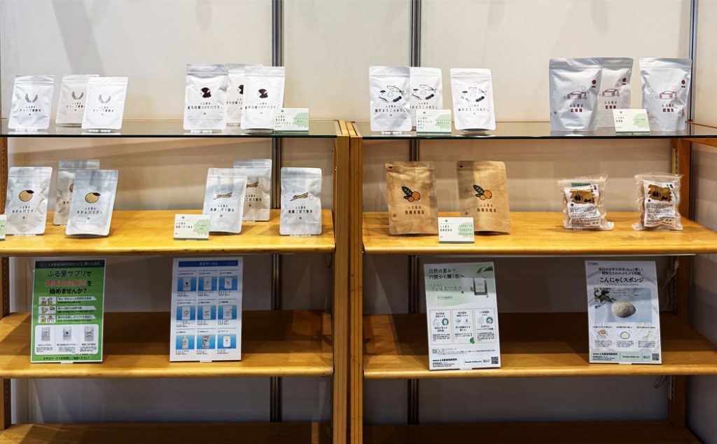 オリーブ葉抹茶パウダー、雪乃白姫SOYパウダー、味わいだしなど、ふる里自慢の原料を使ったサプリを展示し、ふる里原料を使った商品展開についてご提案いたしました。