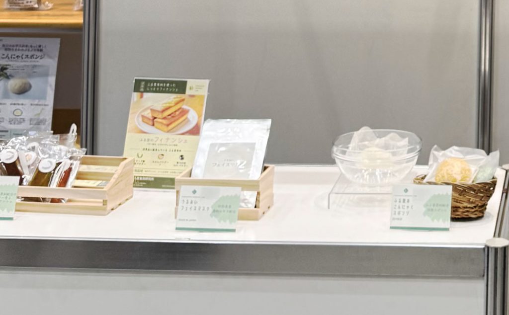 ふる里原料を使用した商品展開の例として、フィナンシェ、フェイスマスク、こんにゃくスポンジのご紹介をしました。